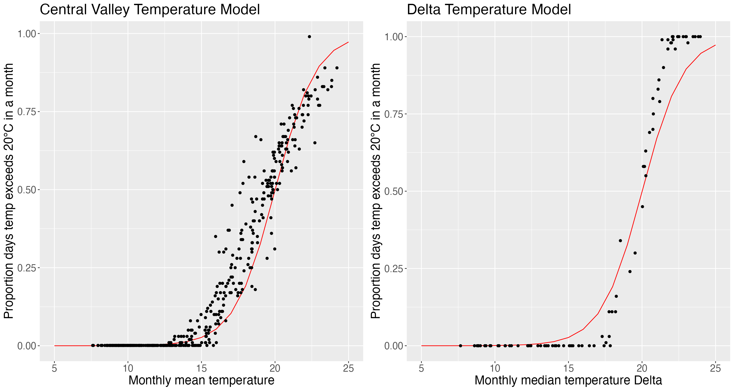 The scatter plots below show the mean monthly temperature and the proportion of measures greater than 20°C for the Delta and Central Valley Rivers. The red line is our logistic model prediction where the monthly temperature ranges between 5°C and 25°C.